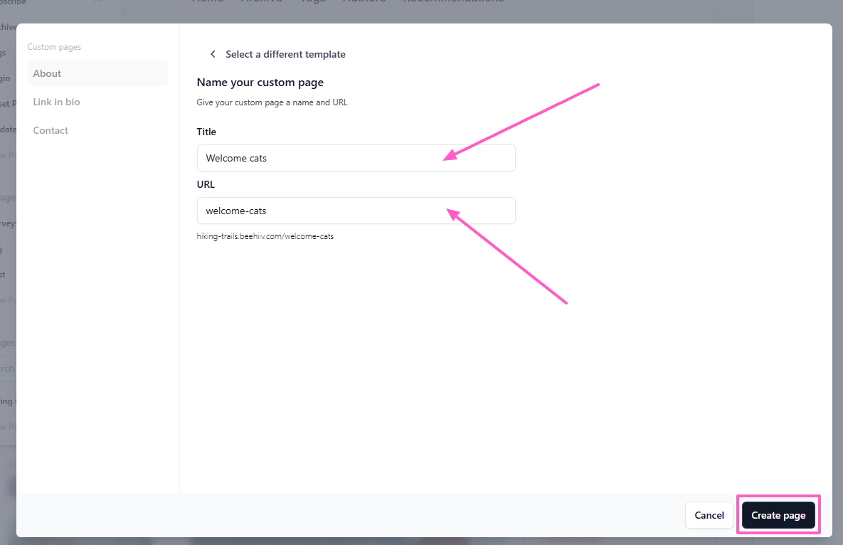 - Enter the Title and URL in the applicable text fields. If you’d like, copy these directly from your legacy site. When done, click on the Create page button.