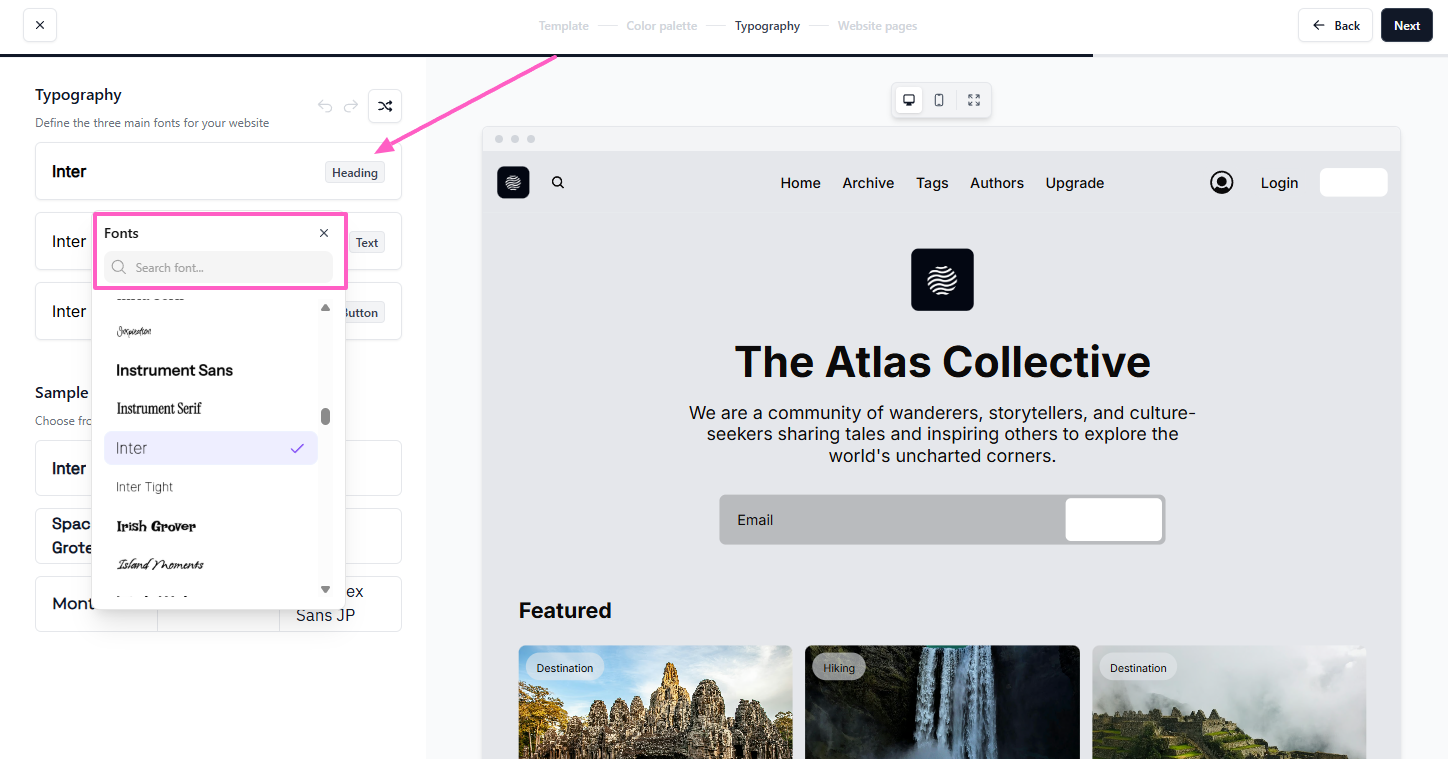 - On the Typography step, you’ll select the fonts for your site. To keep consistency, you can reuse your legacy fonts (by referring back to them).