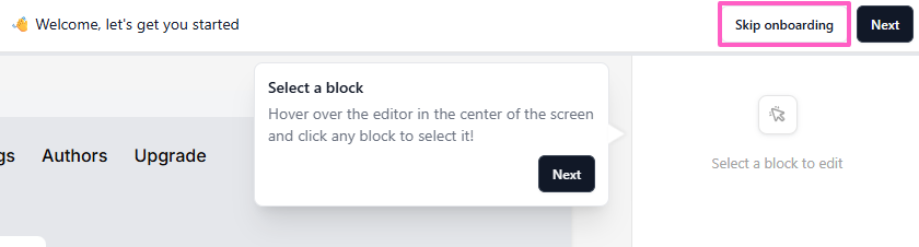 We recommend completing it to get oriented, but you can skip by clicking Skip onboarding at the top of your screen. Otherwise, simply click on the Next button for each step to continue with the onboarding. -
