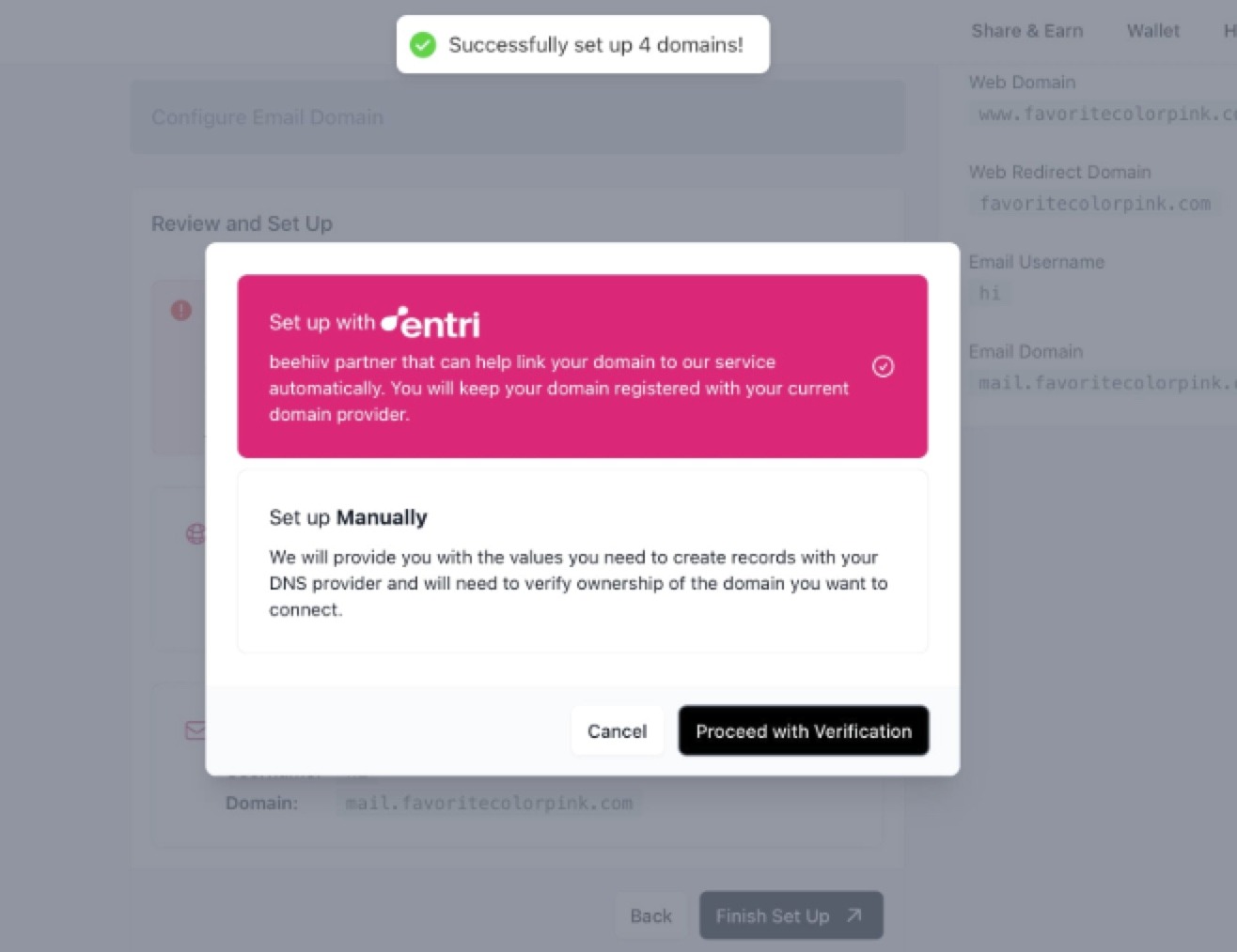 Additionally, if you're repurposing an old website for beehiiv, clicking Finish Setup will overwrite your records if you used the Entri Setup to configure your domain. When using the Manual Setup, make sure to remove any old website DNS records before adding the new ones.